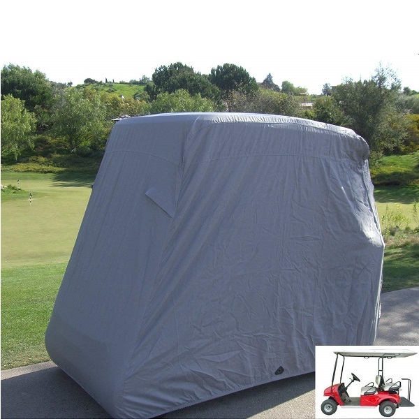 Simply the nicest golf cart cover available! This is NOT a cheap nylon cover like most others on the market. Constructed of heavy duty UV coated satin Polyester with a Polyurethane undercoating. Double top stitched for durability. This cover also features 2 front and 2 rear clamshell vents to prevent condensation and lofting. Rear zipper allows access to cart without removing cover. Grommets at bottom allows cover to be secured or cable locked to cart. This cover will look beautiful on your cart and will protect it for years. Includes duffel bag for storage. *Fits all 4 seater golf carts. Will fit carts with extended roof 80" L. Fits GEM e2 Fits all standard 4 passenger EZ GO, Club Car and YAMAHA golf carts with extended roofs, rear seats, armrests and footrest. Size: 112 inches L x 48 inches W x 66 inches H. Comes in grey, taupe, green, or black.